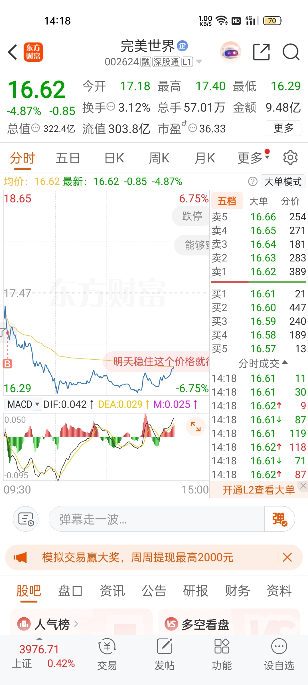 $完美世界(SZ002624)$ 大意了,被动跌停补