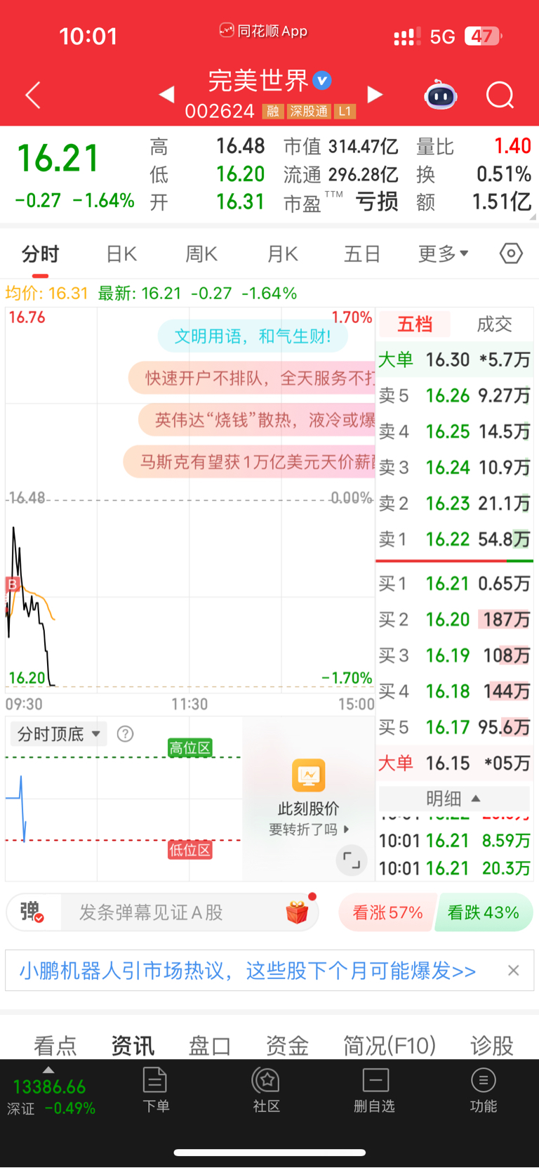 $完美世界(SZ002624)$ 16.31买了点,小t一手,尾盘或者冲高就跑,下次加仓就等14.5左右了