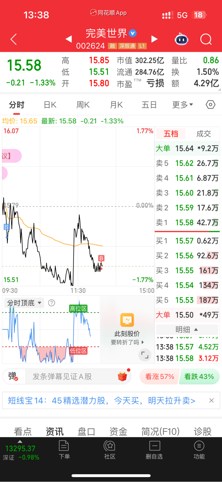 $完美世界(SZ002624)$ 忍不住了,58梭哈了最后半仓,破15.5就把之前的半仓止损了