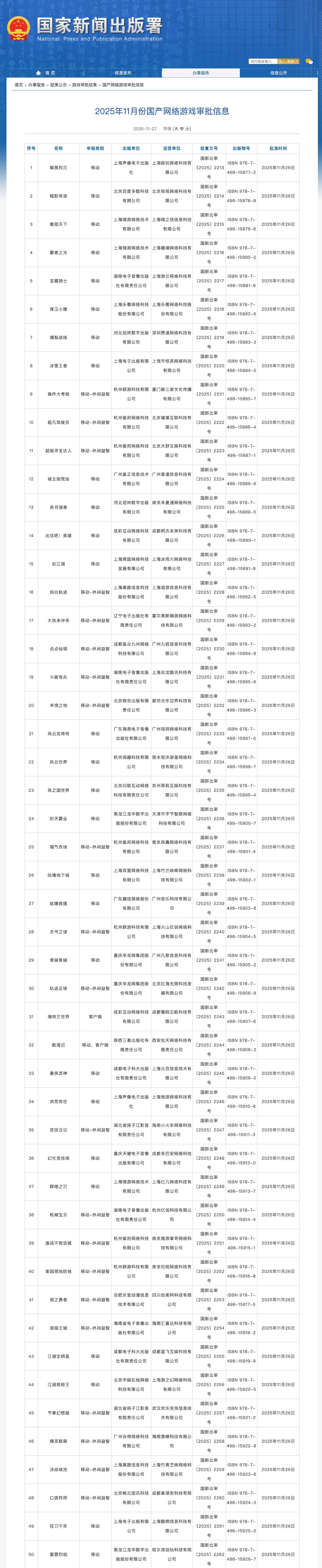 11月27日,界面新闻获悉,国家新闻出版署公布了2025年11月的网络游戏版号审批信息。本批次共有178款国产网络游戏和6款进口游戏获批,版号数量创下近几年新高,表明游戏行业呈现出积极向好的发展态势。