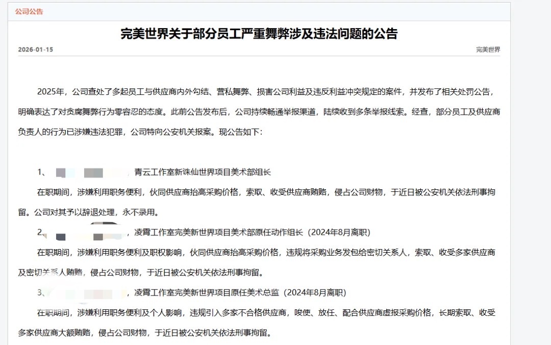 完美世界在公告中表示,2025年查处了多起员工与供应商内外勾结、营私舞弊、损害公司利益的案件,并发布了相关处罚公告,明确表达了对贪腐舞弊行为零容忍的态度。此前公告发布后,公司持续畅通举报渠道,陆续收到多条举报线索。经查,部分员工及供应商负责人的行为已涉嫌违法犯罪,公司特向公安机关报案。