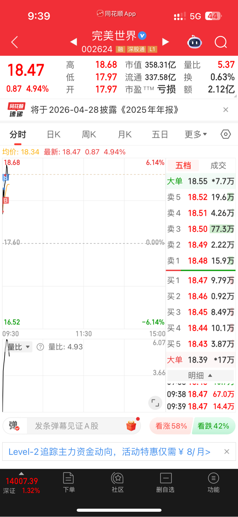 $完美世界(SZ002624)$ t了5个,等回落在全接回来,我是不信这庄会拉涨停。