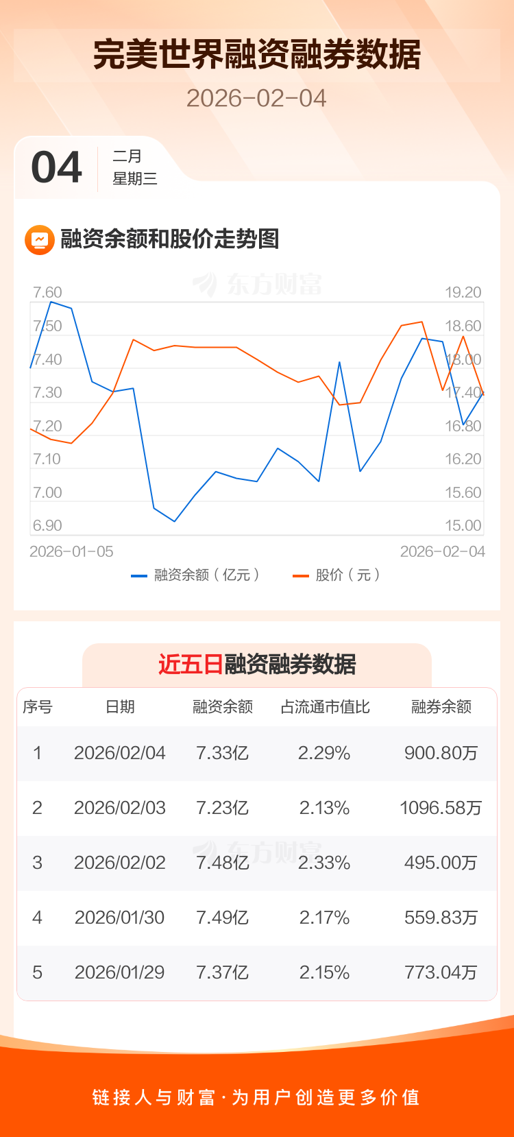 交易所最新数据显示,完美世界于2026年2月4日获融资买入8935.56万元,融资偿还7887.34万元,当日融资净买入1048.22万元。目前,该股融资余额7.33亿,占流通市值比例为2.29%。