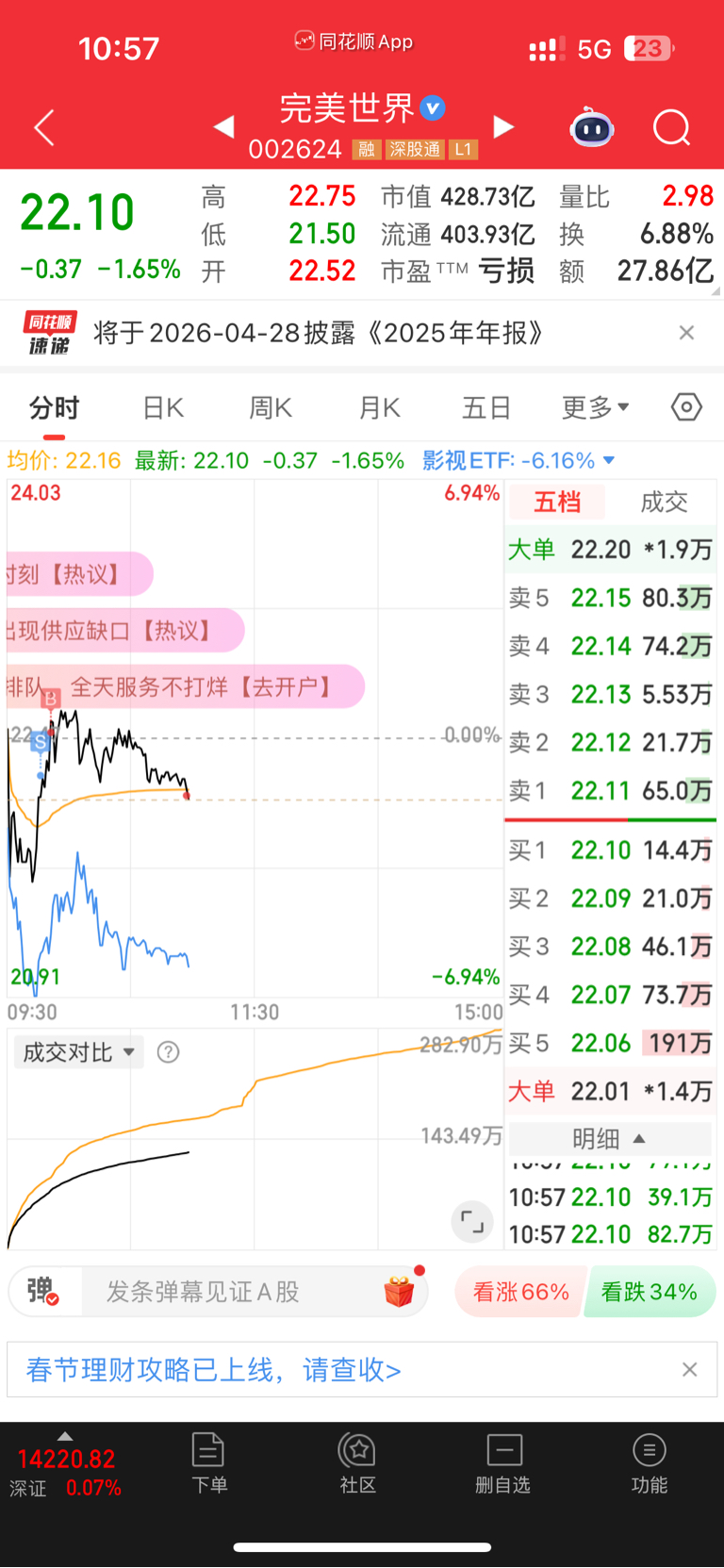 $完美世界(SZ002624)$ 知道你还会跌,22.12还是加了,完美赚钱完美花