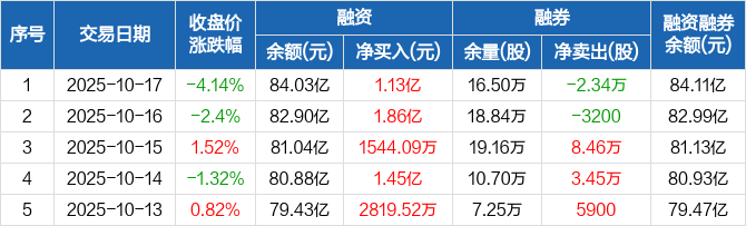 融资方面,当日融资买入3.29亿元,融资偿还2.17亿元,融资净买入1.13亿元,净买入额两市排名第12,连续9日净买入累计8.16亿元。融券方面,融券卖出0股,融券偿还2.34万股,融券余量16.5万股,融券余额763.95万元。融资融券余额合计84.11亿元。