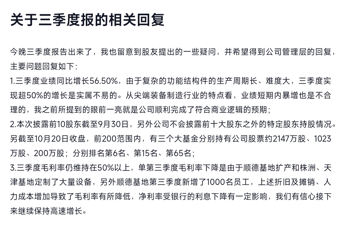 周董关于三季报及股东人数的最新消息