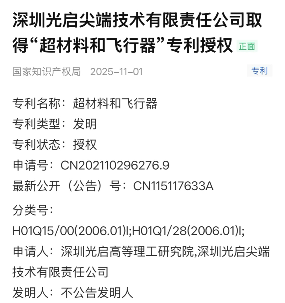 光启尖端获超材料和飞行器专利授权