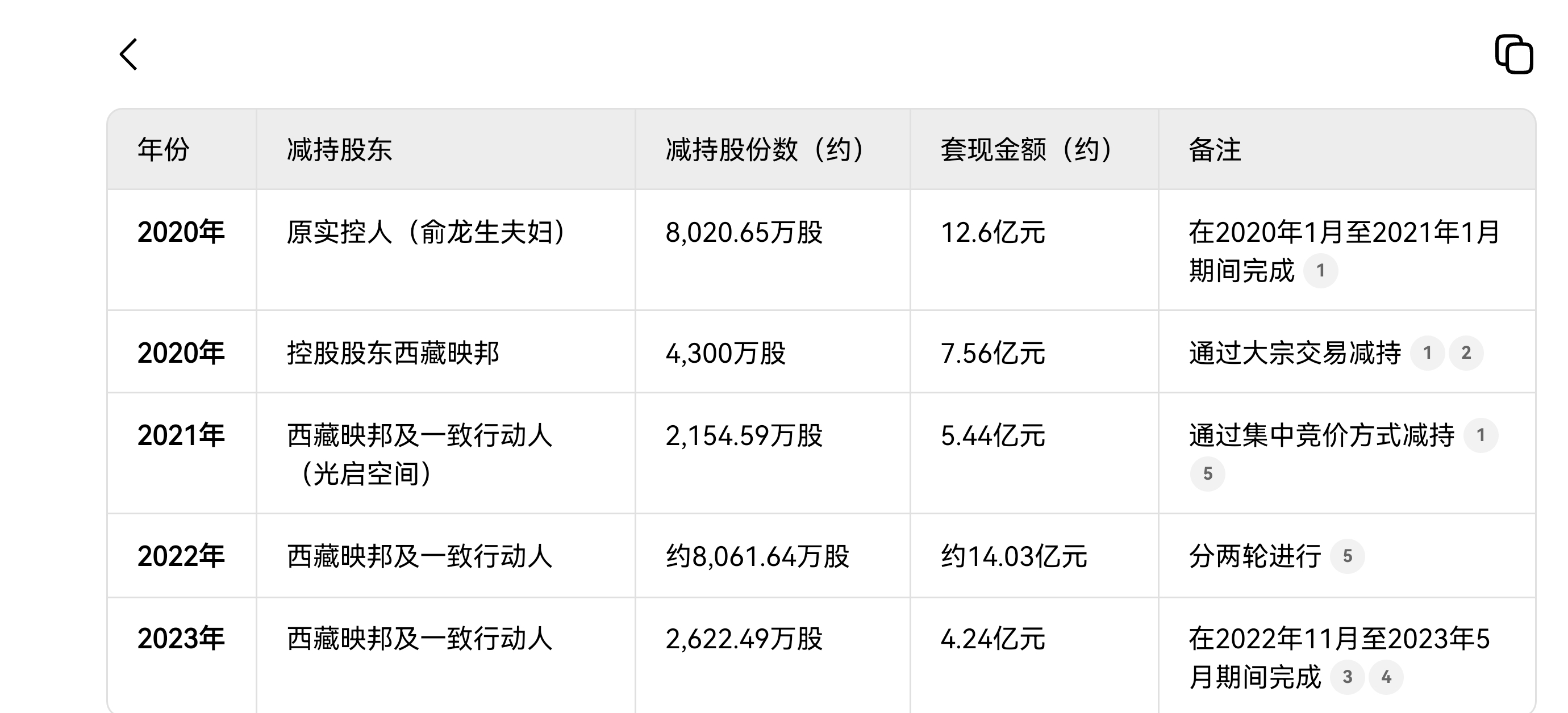 2020年至2023年腾讯元宝统计的大股东减持套现数据,期间股价由33回到最低9.9: