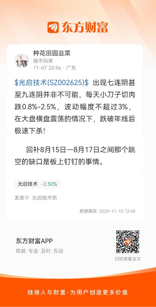 $光启技术(SZ002625)$ 出现七连阴甚至九连阴并非不可能,每天小刀子切肉跌0.8%-2.5%,波动幅度不超过3%,在大盘横盘震荡的情况下,跌破年线后极速下杀!