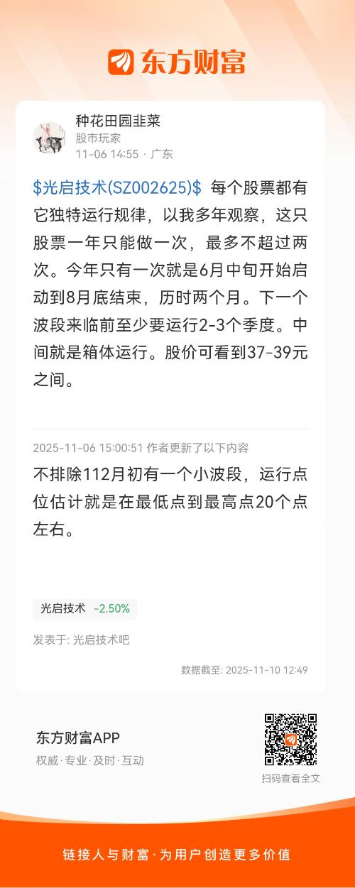 $光启技术(SZ002625)$ 每个股票都有它独特运行规律,以我多年观察,这只股票一年只能做一次,最多不超过两次。今年只有一次就是6月中旬开始启动到8月底结束,历时两个月。下一个波段来临前至少要运行2-3个季度。中间就是箱体运行。股价可看到37-39元之间。
