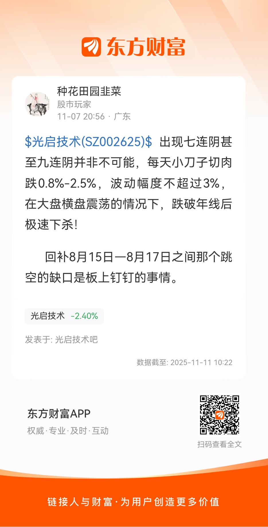 $光启技术(SZ002625)$ 出现七连阴甚至九连阴并非不可能,每天小刀子切肉跌0.8%-2.5%,波动幅度不超过3%,在大盘横盘震荡的情况下,跌破年线后极速下杀!