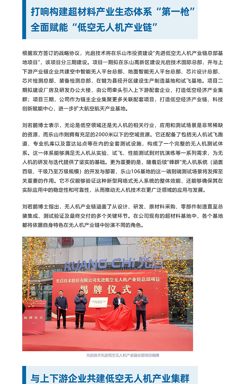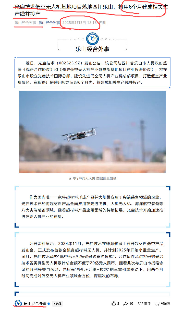 光启技术低空无人机基地项目落地四川乐山,将用6个月建成相关生产线并投产