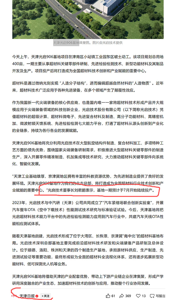 光启技术董事长刘若鹏表示,基地一期预计于7月开始陆续投产。