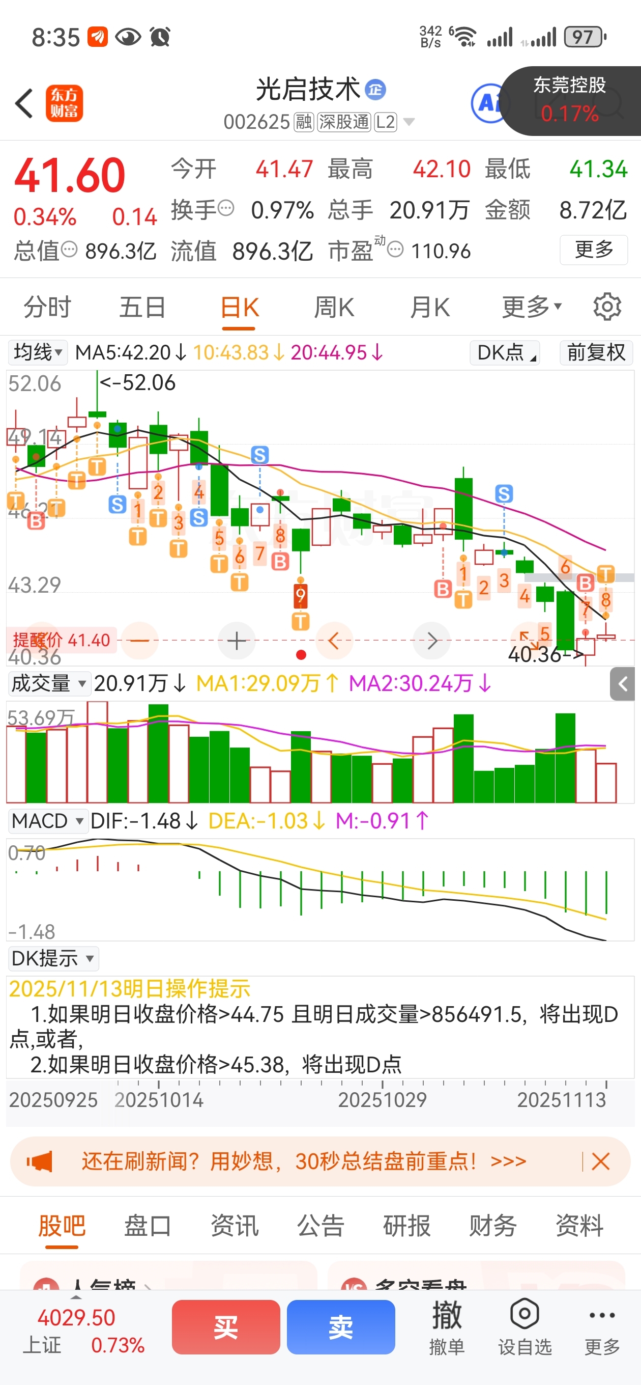 上证指数区间4038-3907光启11月14日做T往上回落做T41.88—42.