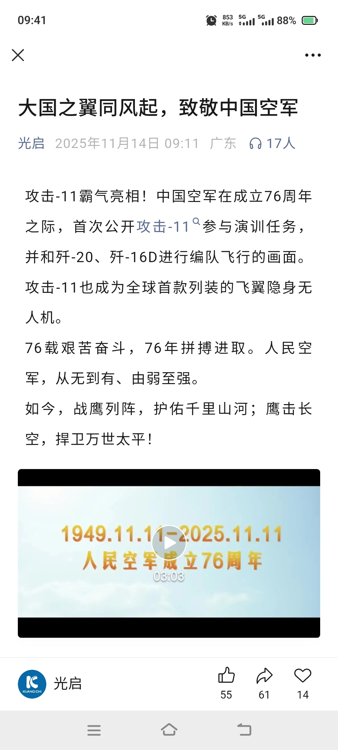 $光启技术(SZ002625)$ 光启技术公众号发文