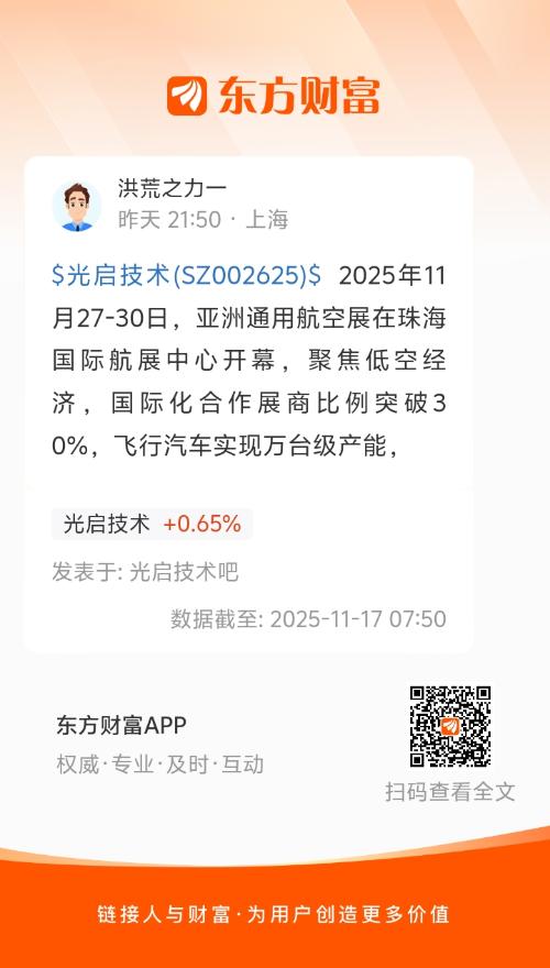 $光启技术(SZ002625)$ 2025年11月27-30日,亚洲通用航空展在珠海国际航展中心开幕,聚焦低空经济,国际化合作展商比例突破30%,飞行汽车实现万台级产能,