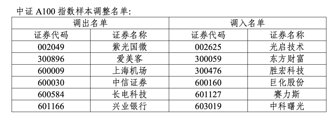 中证A100指数更换6只样本,东方财富、光启技术、中科曙光等调入指数,调出名单包括上海机场、紫光国微、中信证券等。