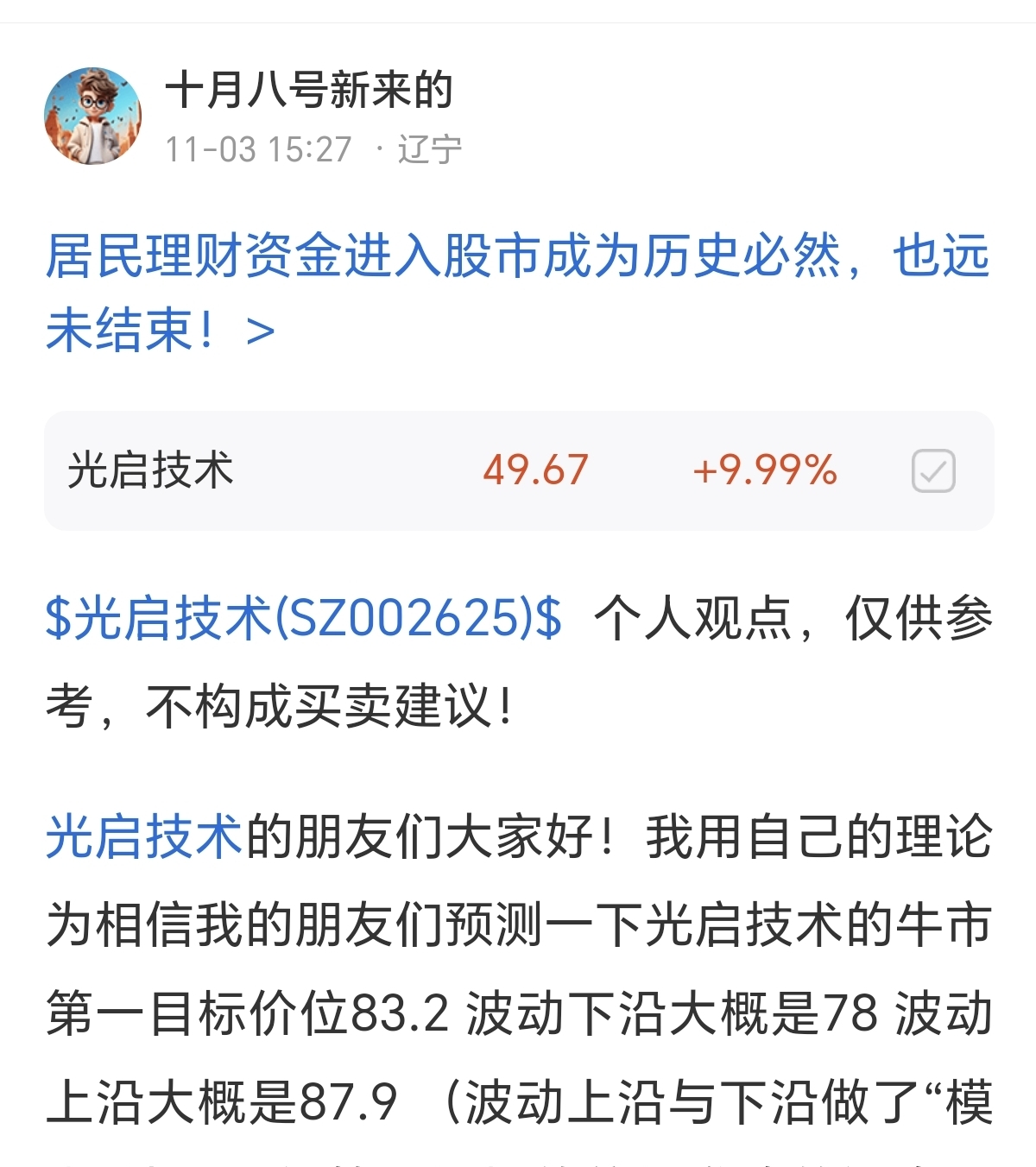 $光启技术(SZ002625)$ 恭喜持有光启技术的朋友,集合竞价涨停,我在11月份就公开发表分析了光启技术的第一目标价位!中间主力虽然挖了“黄金坑”但这并不能改变光启技术的目标价位!很多人看了我的分析就认为会涨,哪有那么多的好事儿呢?请问你忍不住下跌,那么大涨凭什么有你?