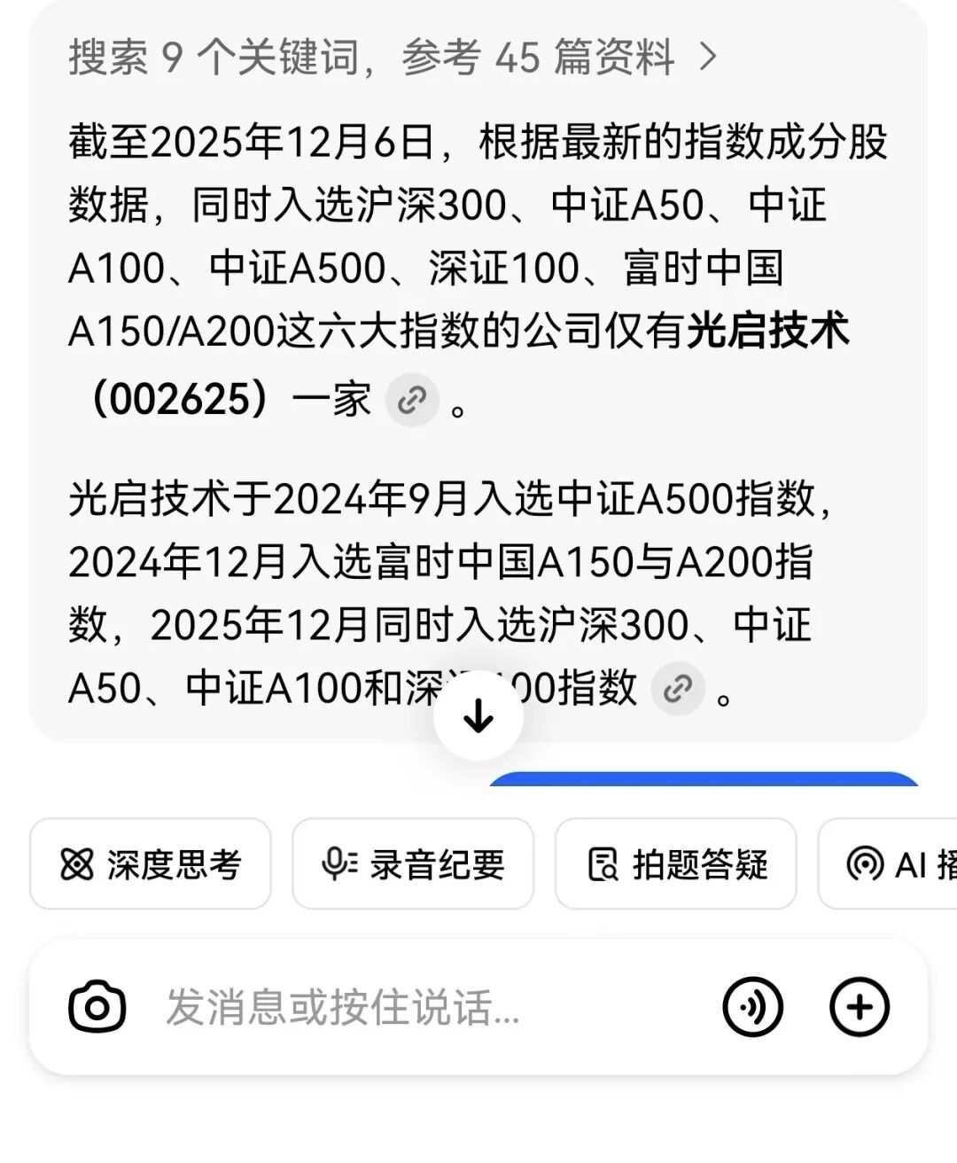 另外,有人问豆包,结果;光启技术是唯一入选六大指数的A股