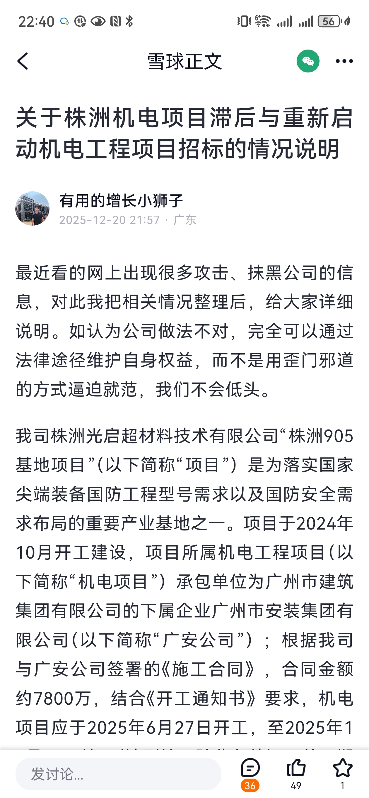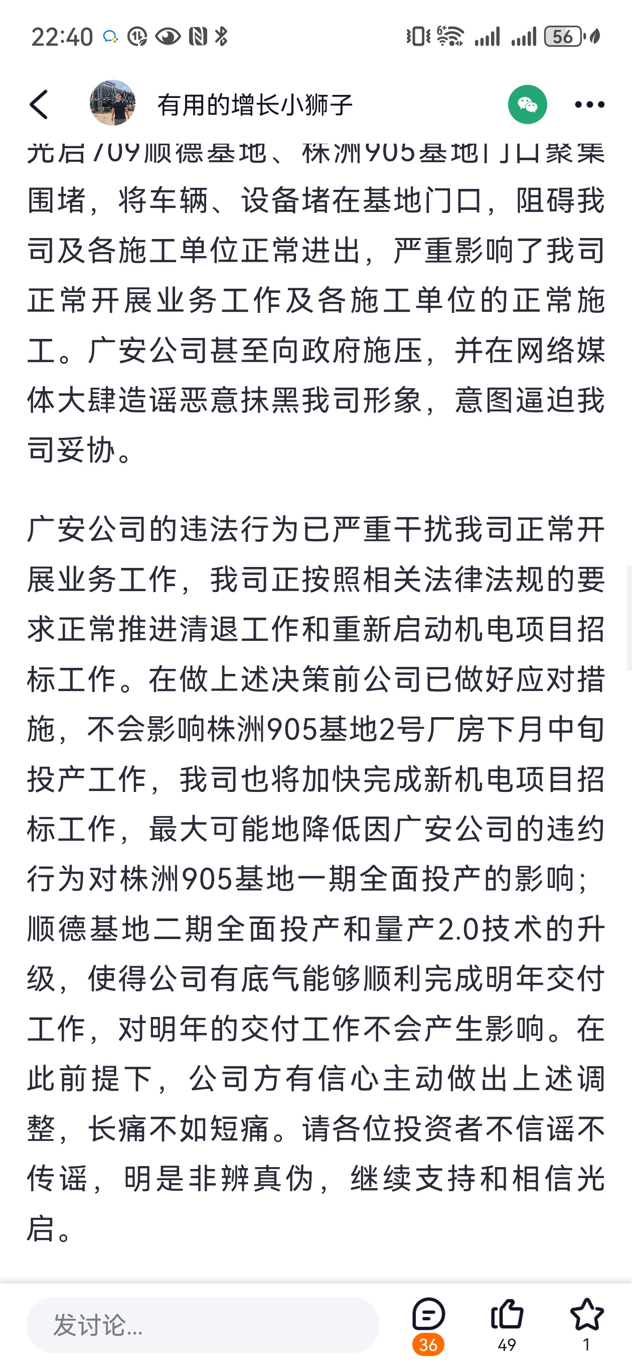 广安公司的违法行为已严重干扰我司正常开展业务工作,我司正按照相关法律法规的要求正常推进清退工作和重新启动机电项目招标工作。在做上述决策前公司已做好应对措施,不会影响株洲905基地2号厂房下月中旬投产工作,我司也将加快完成新机电项目招标工作,最大可能地降低因广安公司的违约行为对株洲905基地一期全面投产的影响;顺德基地二期全面投产和量产2.0技术的升级,使得公司有底气能够顺利完成明年交付工作,对明年的交付工作不会产生影响。在此前提下,公司方有信心主动做出上述调整,长痛不如短痛。请各位投资者不信谣不传谣,明是非辨真伪,继续支持和相信光启。