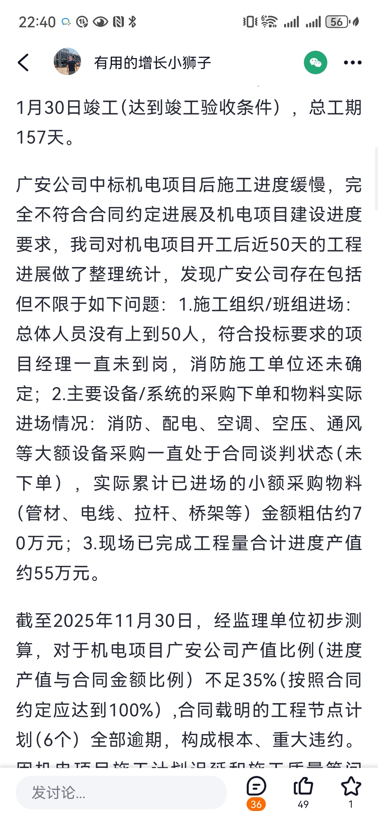 截至2025年11月30日,经监理单位初步测算,对于机电项目广安公司产值比例(进度产值与合同金额比例)不足35%(按照合同约定应达到100%),合同载明的工程节点计划(6个)全部逾期,构成根本、重大违约。因机电项目施工计划迟延和施工质量等问题,监理单位依据项目管理规定多次向广安公司出具罚款整改单。针对机电项目施工进度严重迟滞且已对株洲905基地其他参建单位的施工进度造成直接、严重影响,我司与监理单位组织广安公司召开了多次专题调度会,收效甚微。
