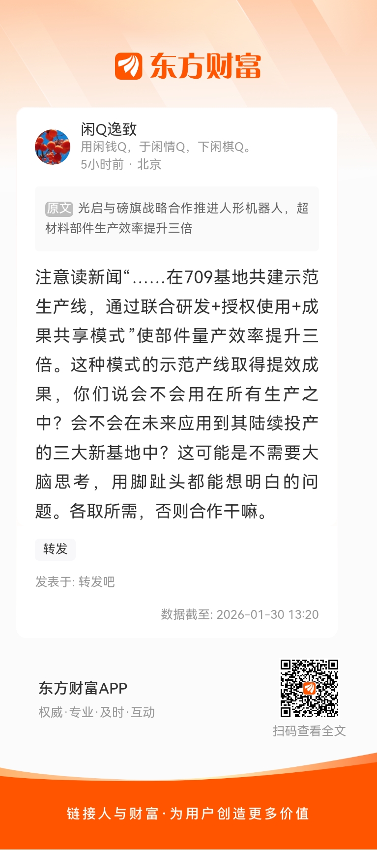 //@闲Q逸致 :注意读新闻“……在709基地共建示范生产线,通过联合研发+授权使用+成果共享模式”使部件量产效率提升三倍。这种模式的示范产线取得提效成果,你们说会不会用在所有生产之中?会不会在未来应用到其陆续投产的三大新基地中?这可能是不需要大脑思考,用脚趾头都能想明白的问题。各取所需,否则合作干嘛。