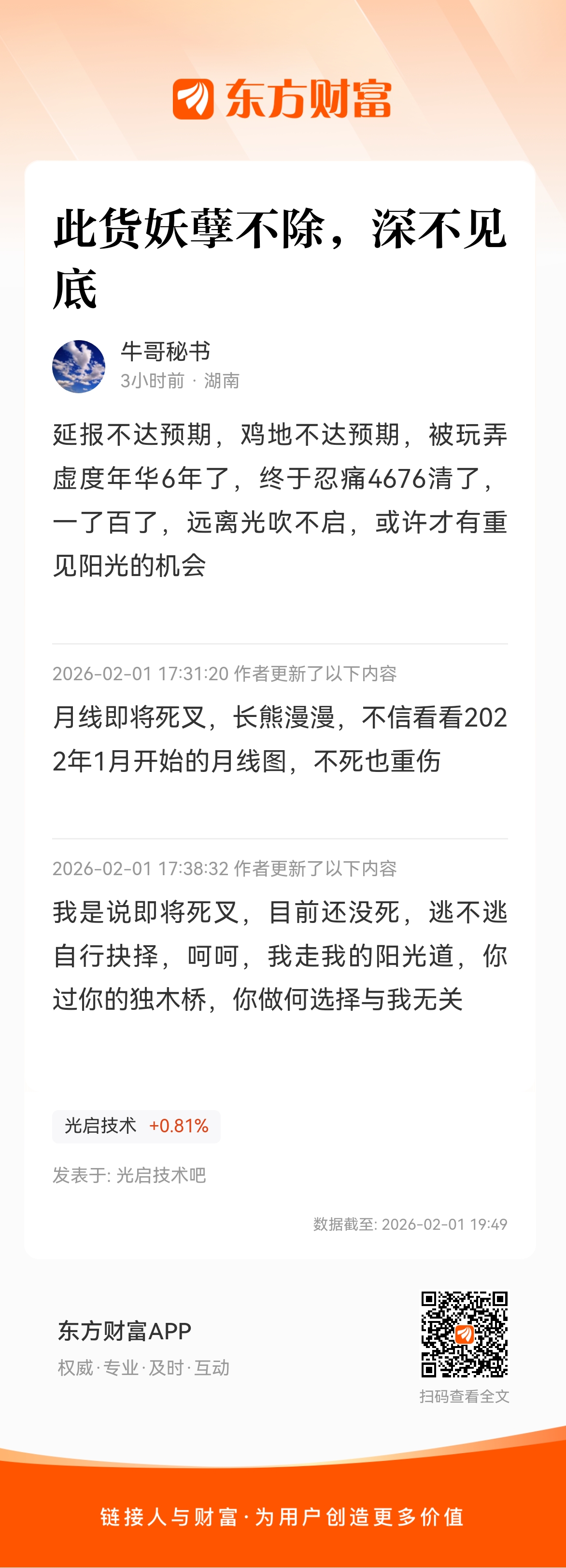 温馨提示: 1.根据《证券法》规定,禁止编造、传播虚假信息或者误导性信息,扰乱证券市场;2.用户在本社区发表的所有资料、言论等仅代表个人观点,与本网站立场无关,不对您构成任何投资建议。用户应基于自己的独立判断,自行决定证券投资并承担相应风险。《东方财富社区管理规定》