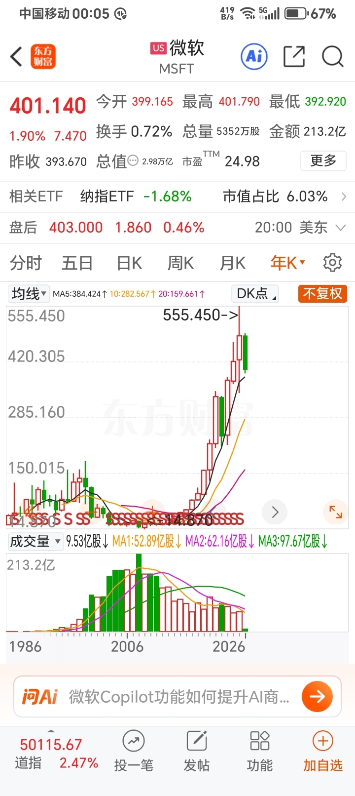 看看微软股票走势,1986年微软icon上市,比尔盖茨icon拥有45%的股份。