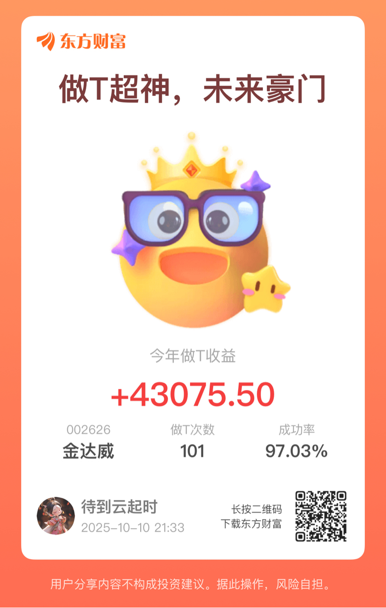 $金达威(SZ002626)$ 大威的仓位减到半仓了,债的部分没动,依旧每日持续做T中,不要觉得做T赚不到钱,慢慢积累起来其实也挺可观的……