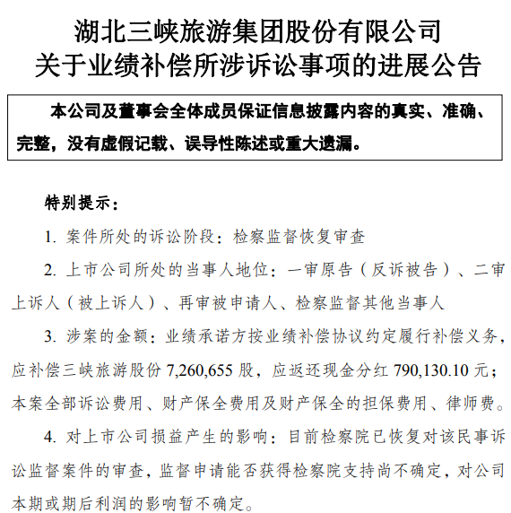 目前检察院已恢复对该民事诉讼监督案件的审查。三峡旅游表示,监督申请最终能否获得检察院支持尚不确定,对公司本期或期后利润的影响暂不确定。