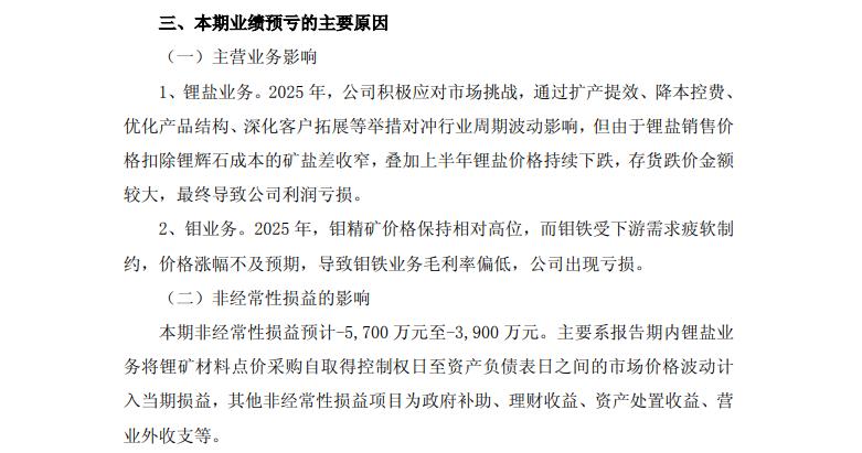 二、永杉锂业。公司主营业务为电池级碳酸锂和电池级氢氧化锂。公司预计,2025年归母净利润为亏损3.1亿~3.9亿,同比增长-1634.13% ~ -1319.44%,上年净利润为0.25亿。2025上半年公司收入占比,钼业分部占74.19%,锂业分部占25.81%。今年金属价格涨幅很大,也因此金属公司的K线涨幅很大,永杉锂业亏损的原因是上半年锂矿和钼铁价格不及预期。