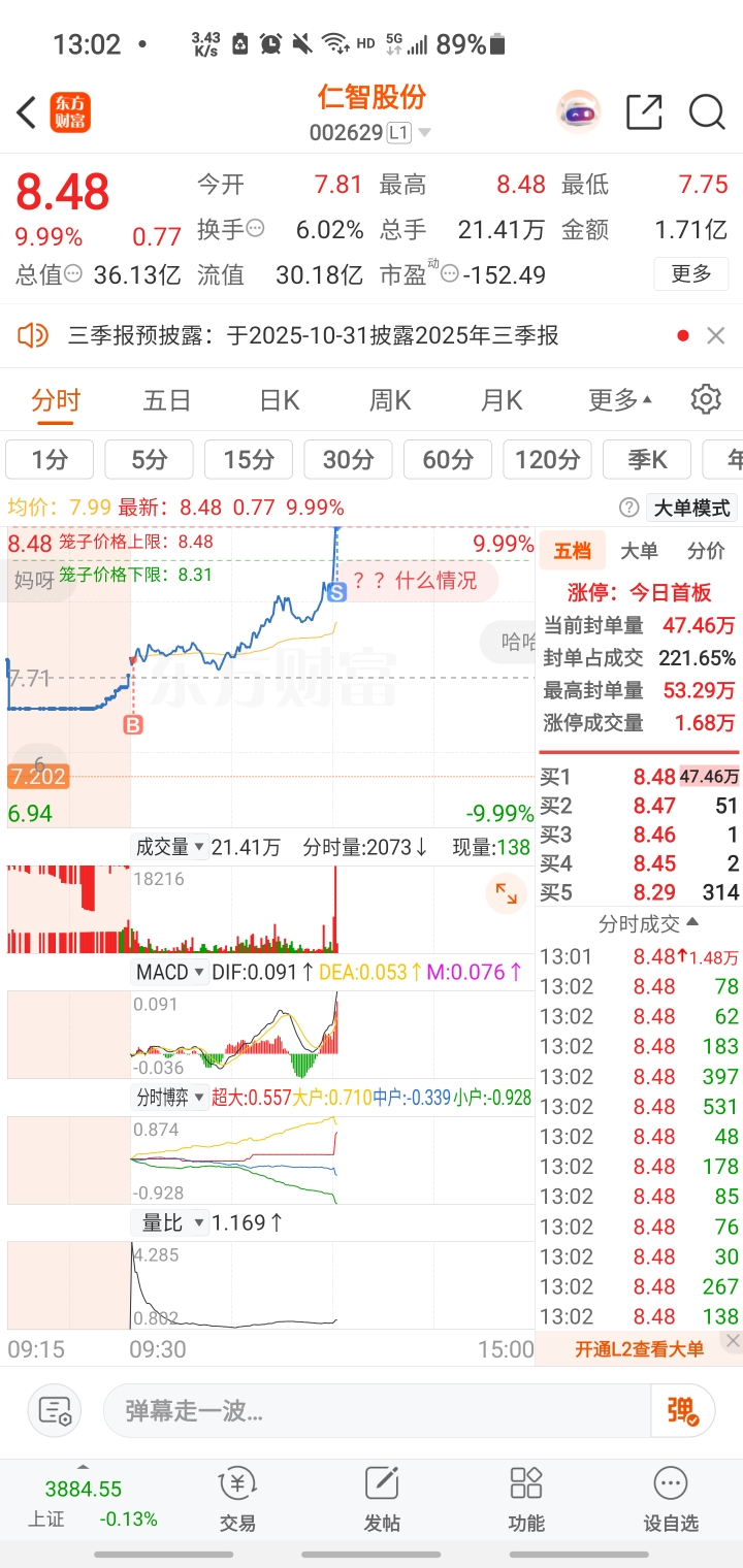 $仁智股份(SZ002629)$ 感谢1.48万手封板哥