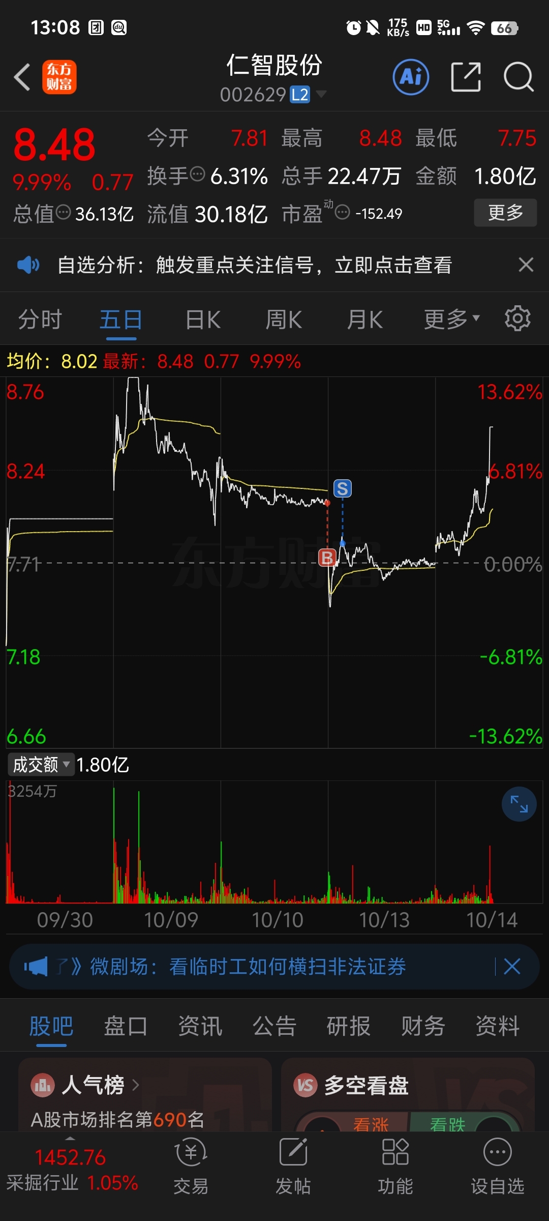 $仁智股份(SZ002629)$ 唉,韭菜一枚