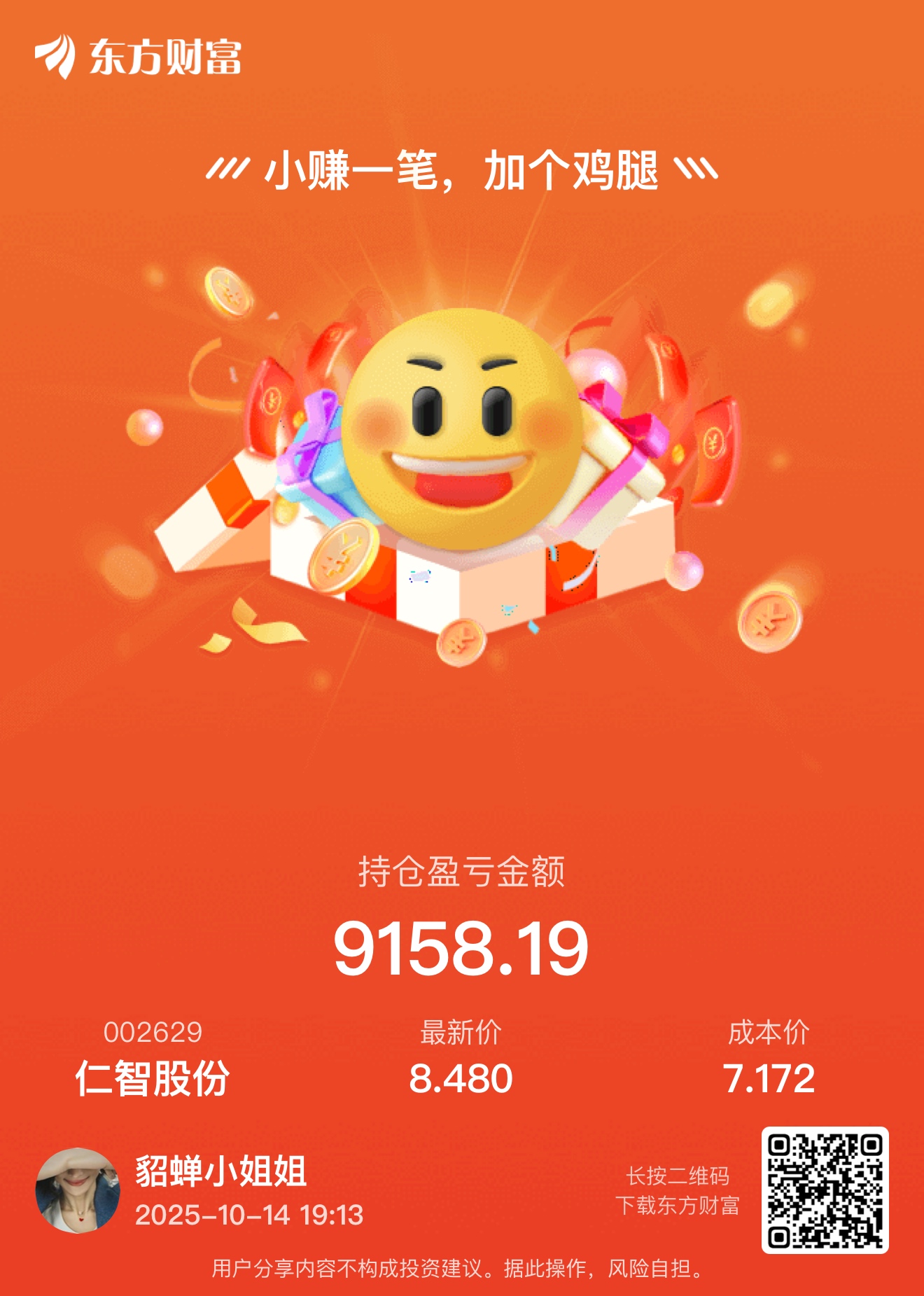 $仁智股份(SZ002629)$ #收盘点评# #复盘记录# #投资随笔# 要准备走咯,算今天不出三日要跑路了,明天出一半,涨到9块再出剩下一半,这股涨几天,横几周,这周内落袋为安就好