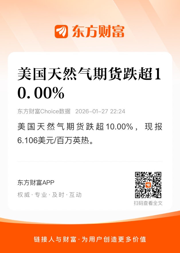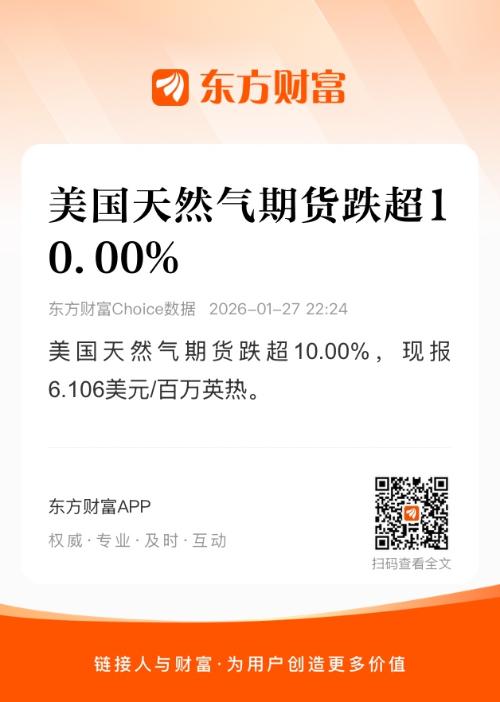 美国天然气期货跌超10.00%,现报6.106美元/百万英热。