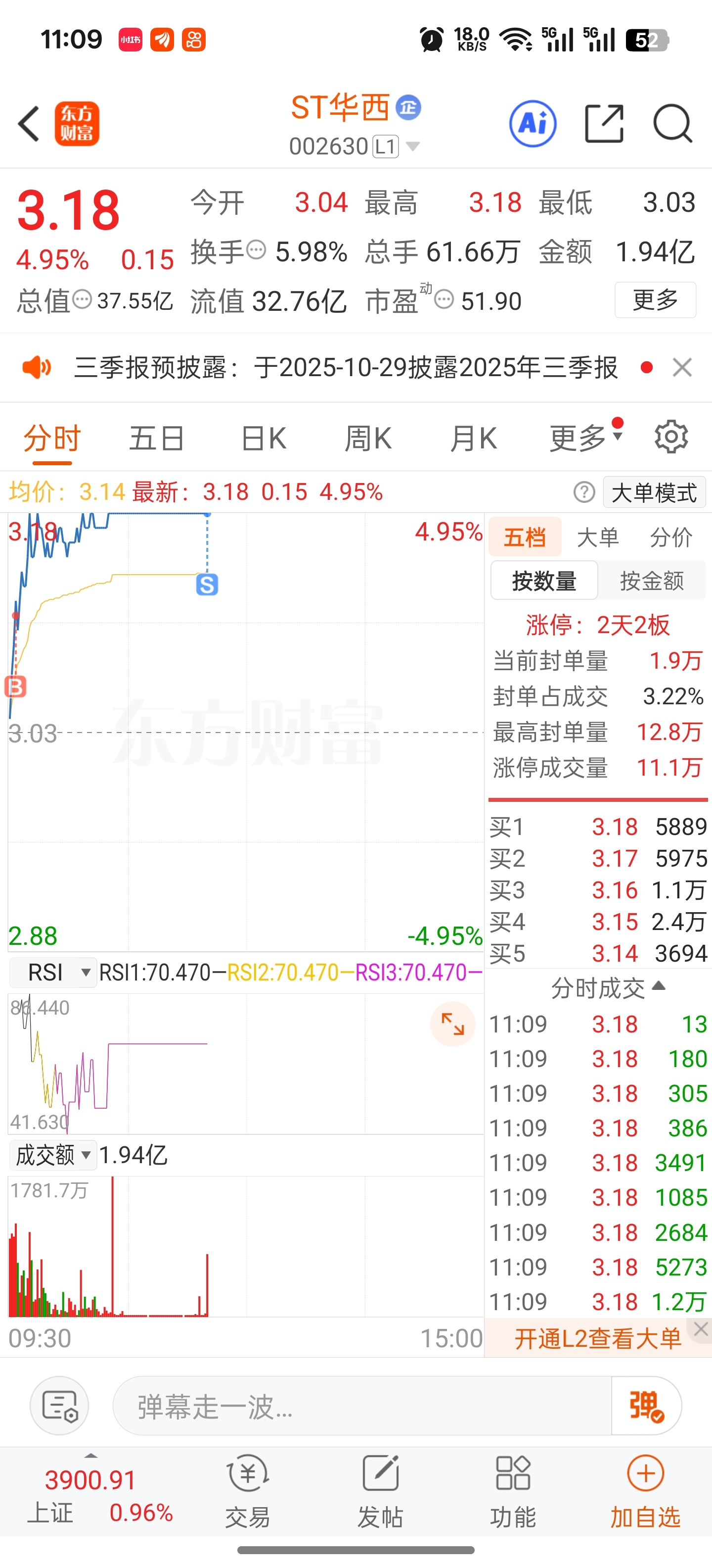 $ST华西(SZ002630)$ 最高在回封,明天把今天的在跑了