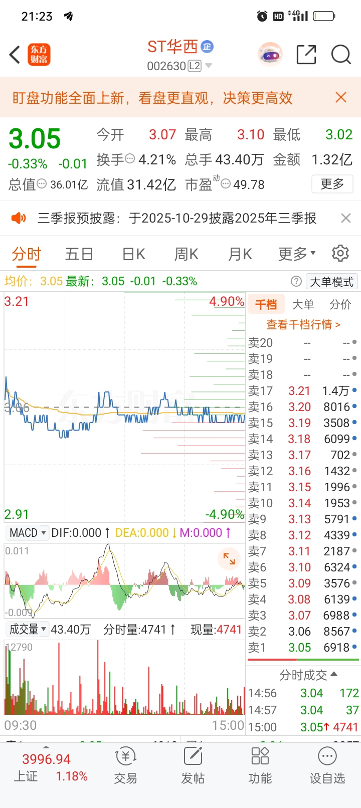 $ST华西(SZ002630)$ 其实华西这几天就是技术性调整,已经调整结束。东财的朋友们,不要跌了就看跌,唱空,这样赚的钱心不黑吗?我在华西2.48就开始进来做到现在,以前一直有水军贴天天唱空说的很离普吓你下车割肉,这地方就是底部了,主力要是出货,还会拉到2.23让你们之前的解套吗?只要有十几个人同时点火这就是起爆发向上。东财朋友别为5分6分在那T在那压单,拿稳扶好,逢跌就是干。华西未来可期。