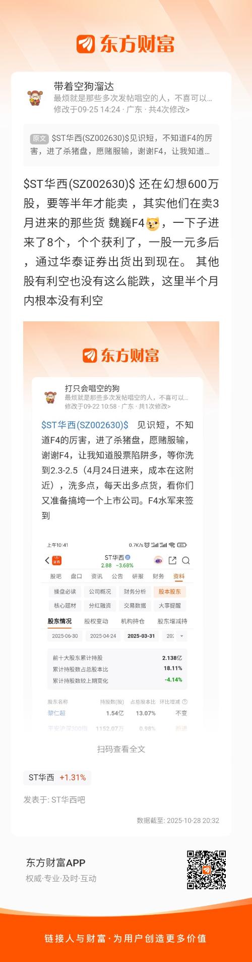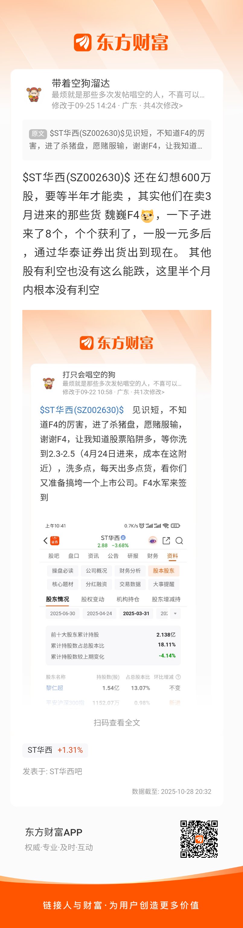 $ST华西(SZ002630)$ 见识短,不知道F4的厉害,进了杀猪盘,愿赌服输,谢谢F4,让我知道股票陷阱多,等你洗到2.3-2.5(4月24日进来,成本在这附近),洗多点,每天出多点货,看你们又准备搞垮一个上市公司。F4水军来签到