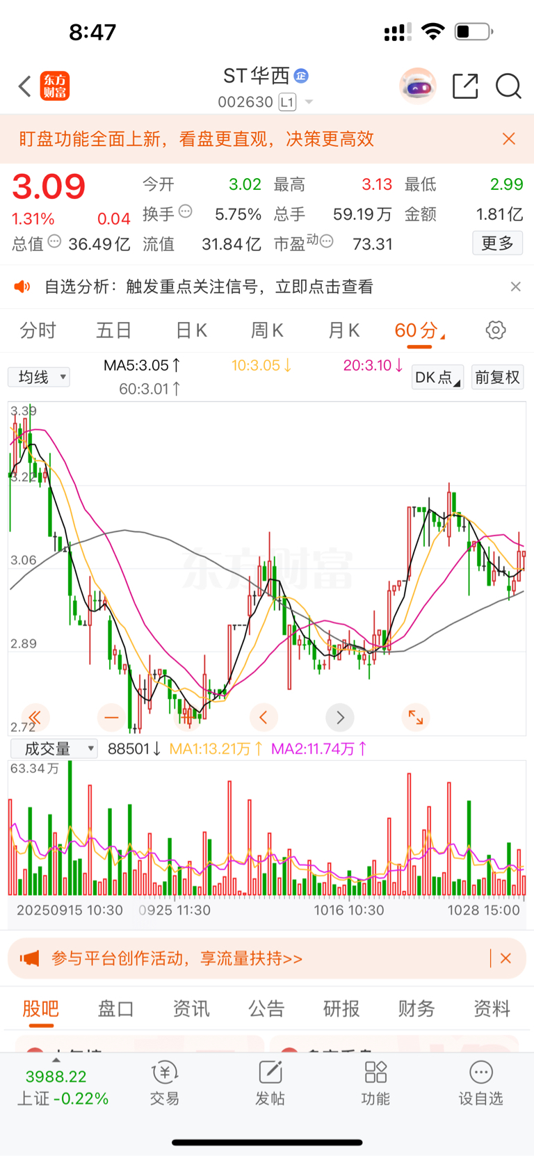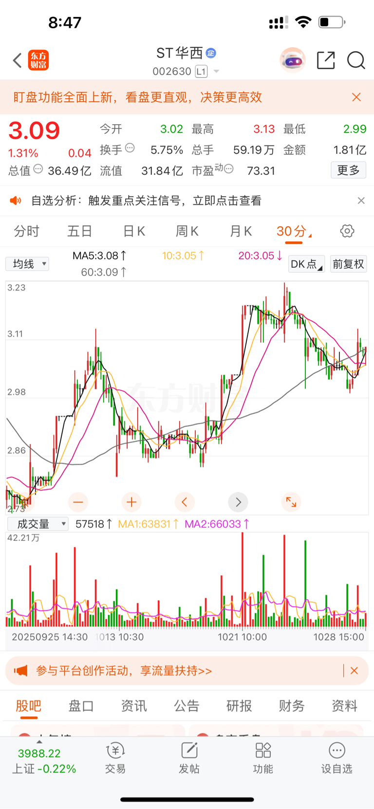 $ST华西(SZ002630)$ ST没利空就是利好,技术面30分钟和60分钟线已经呈现下一个波段拐点,明天大概率大阳或涨停!立帖为证!