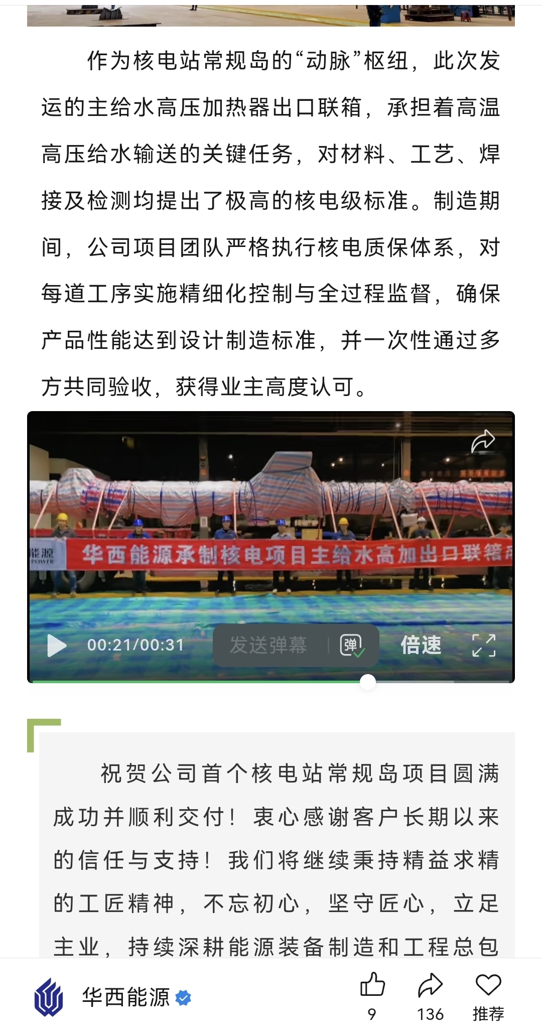 $ST华西(SZ002630)$ 祝贺公司首个核电站常规岛项目圆满成功并顺利交付!
