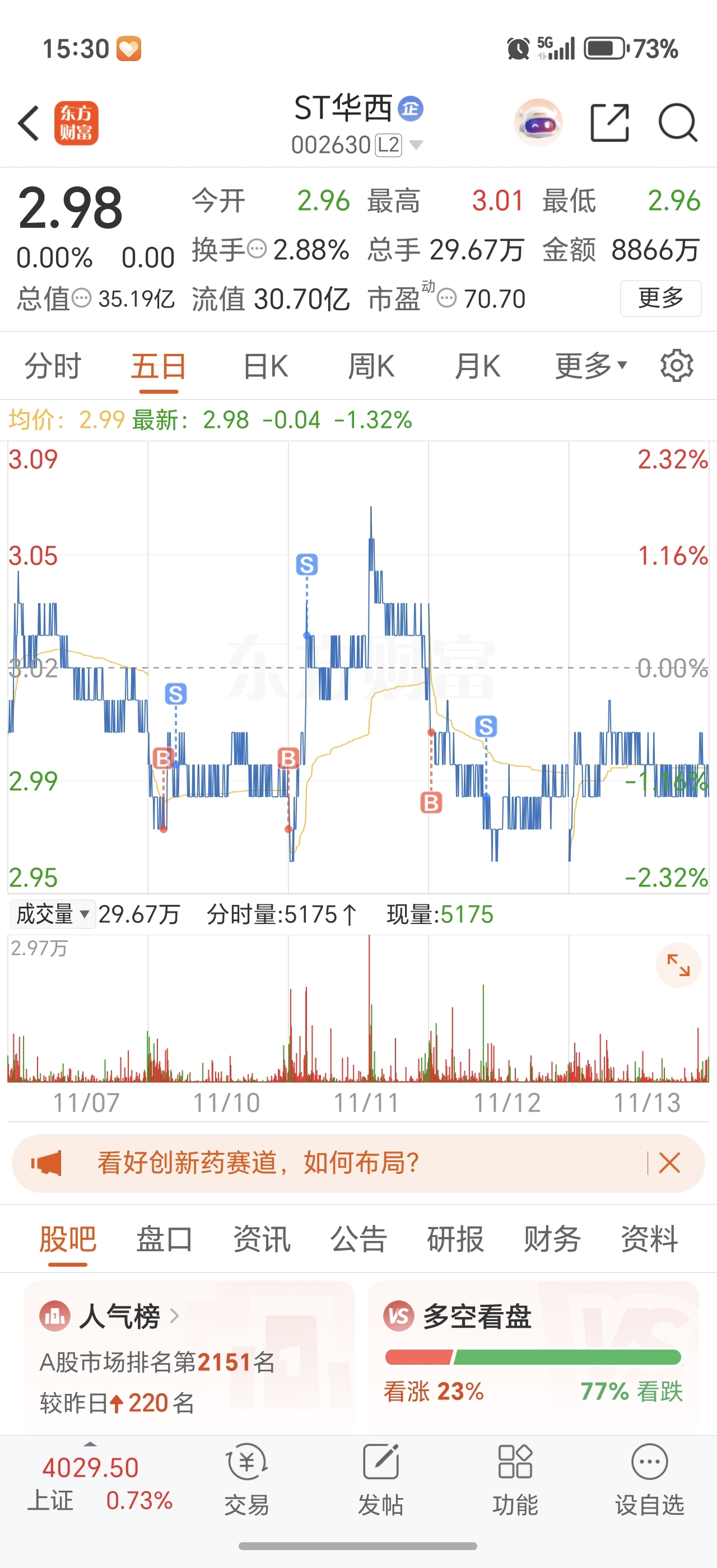 $ST华西(SZ002630)$ 本来每天都T的 结果都说是没格局 难道我有格局就涨了吗