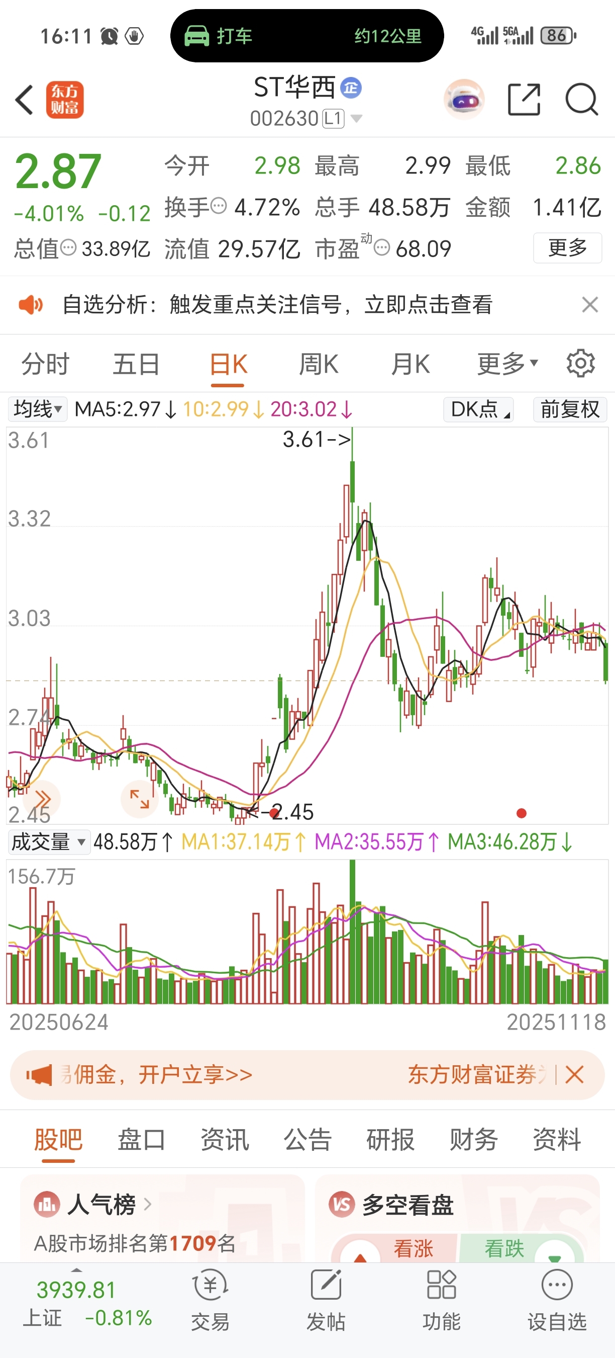 $ST华西(SZ002630)$ 主力资金提着大炮和镰刀来了,要么听到了雷声开炮跑路,要么大刀砍向韭菜,又的下探,磨底,下探磨底。了,今天突然变天,大家跑路吗。