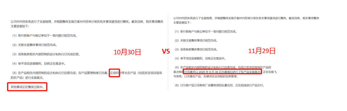 如图所示,10月30日还有其他正在整改过程中的事项,11月29日公告明确6个事项全部完成。
