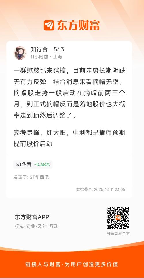 一群憨憨也来瞎搞,目前走势长期阴跌无有力反弹,结合消息来看摘帽无望。摘帽股走势一般启动在摘帽前两三个月,到正式摘帽反而是落地股价也大概率走到顶然后调整了。