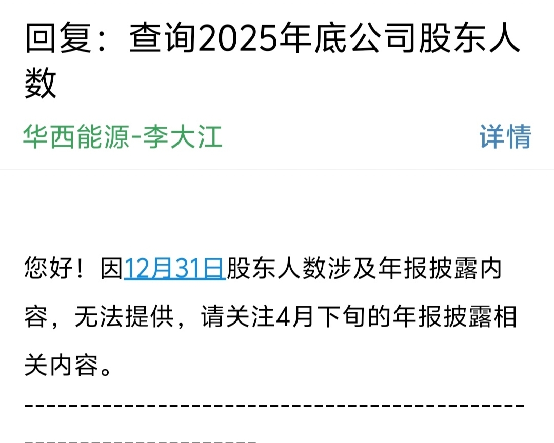 $ST华西(SZ002630)$ 作为股东,有权利知道股东人数吧,公司竟然这样回答的,只要发邮件去,有身份证明,多数公司都会回答,这也不是什么大秘密,公司既然不回答,肯定是应某些人的要求