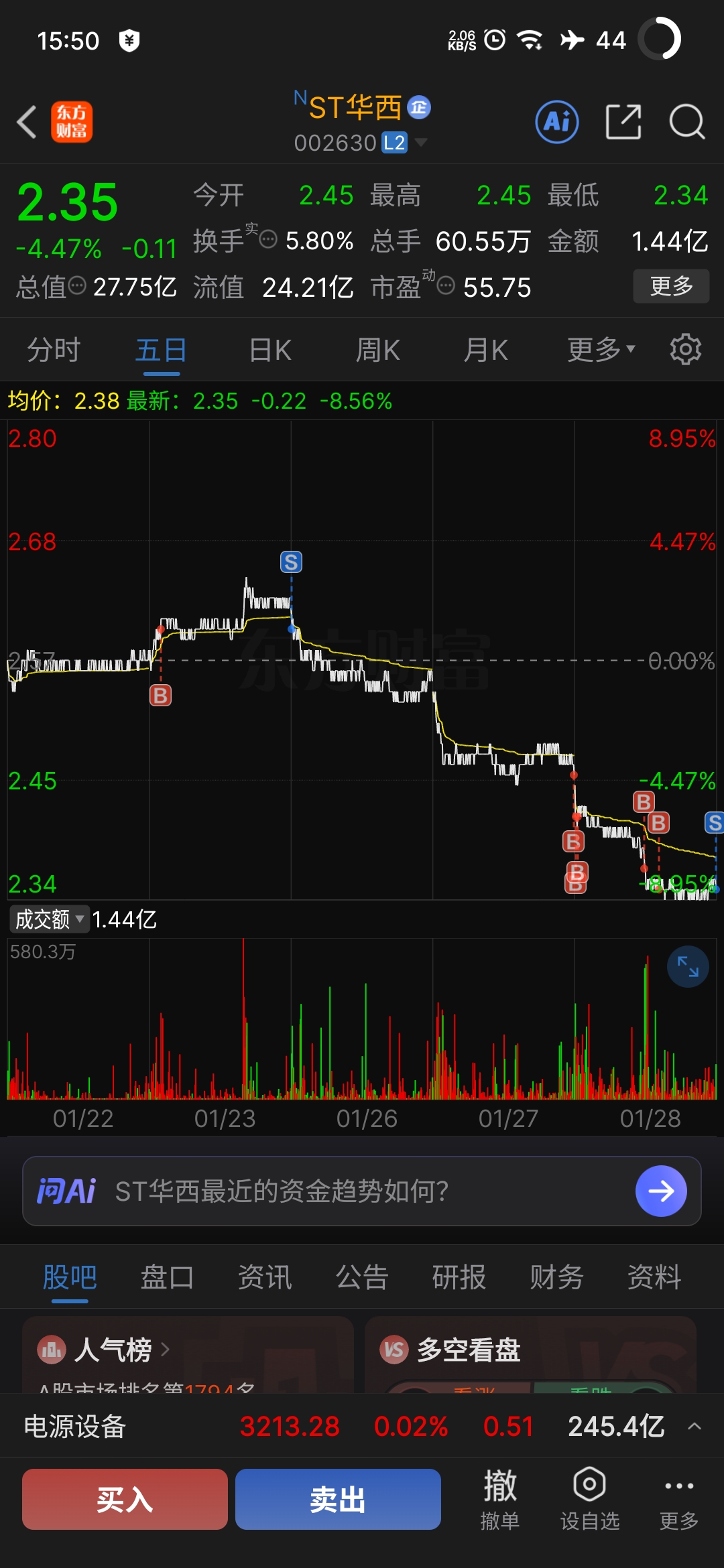 $ST华西(SZ002630)$ 昨天尾盘买入的!今天跌停我是没想到的……前两天跌幅加起来跌-6%!大概率是资金对年预报恐慌ST板块回调导致!今天接近跌停感觉是非理性的!最近ST板块可能大幅回调,买啥股都是错!最近还是在华西里面轻仓做T!等ST板块回调过去再说!