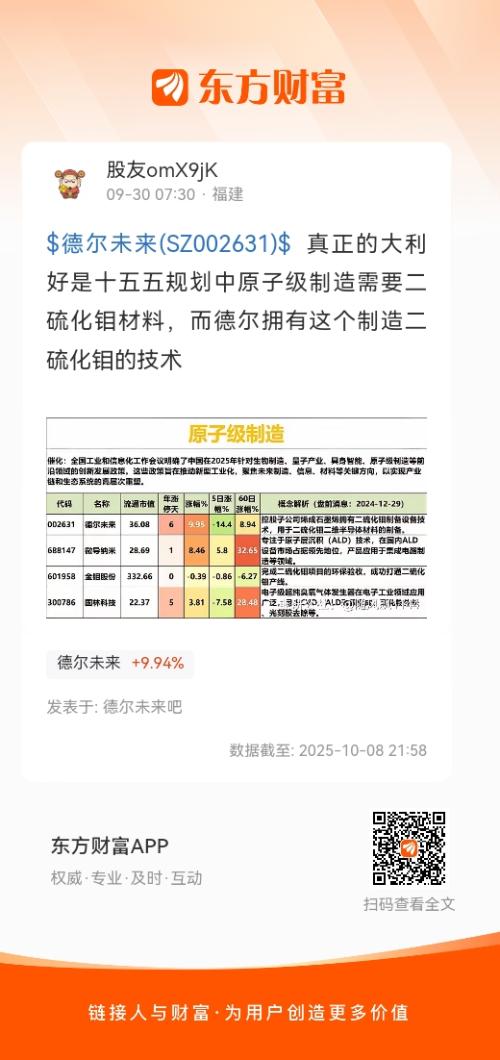$德尔未来(SZ002631)$  真正的大利好是十五五规划中原子级制造需要二硫化钼材料,而德尔拥有这个制造二硫化钼的技术