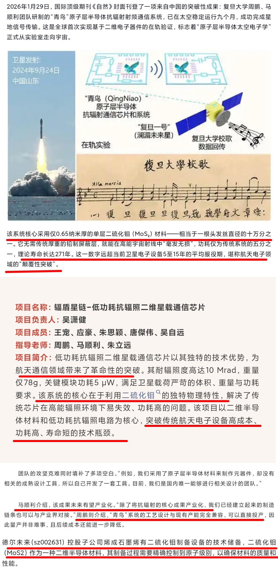 太空器件革命性突破 关键核心材料是二硫化钼,$德尔未来(SZ002631)$ 控股子公司烯成石墨烯有二硫化钼制备设备的技术储备,周鹏则介绍,“青鸟”系统的工艺设计与现有产能完全兼容,可以直接投产,量产并非难事,且后续成本还能进一步降低,有望产业化可以和相关产业界对接。。。。