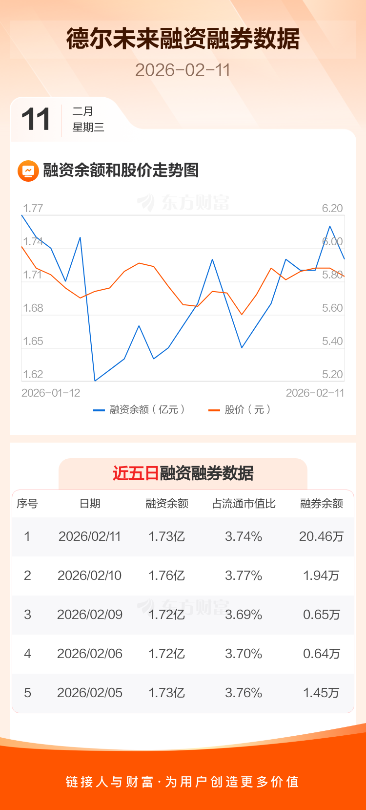 交易所最新数据显示,德尔未来于2026年2月11日获融资买入414.68万元,融资偿还687.37万元,当日融资净偿还272.69万元。目前,该股融资余额1.73亿,占流通市值比例为3.74%。