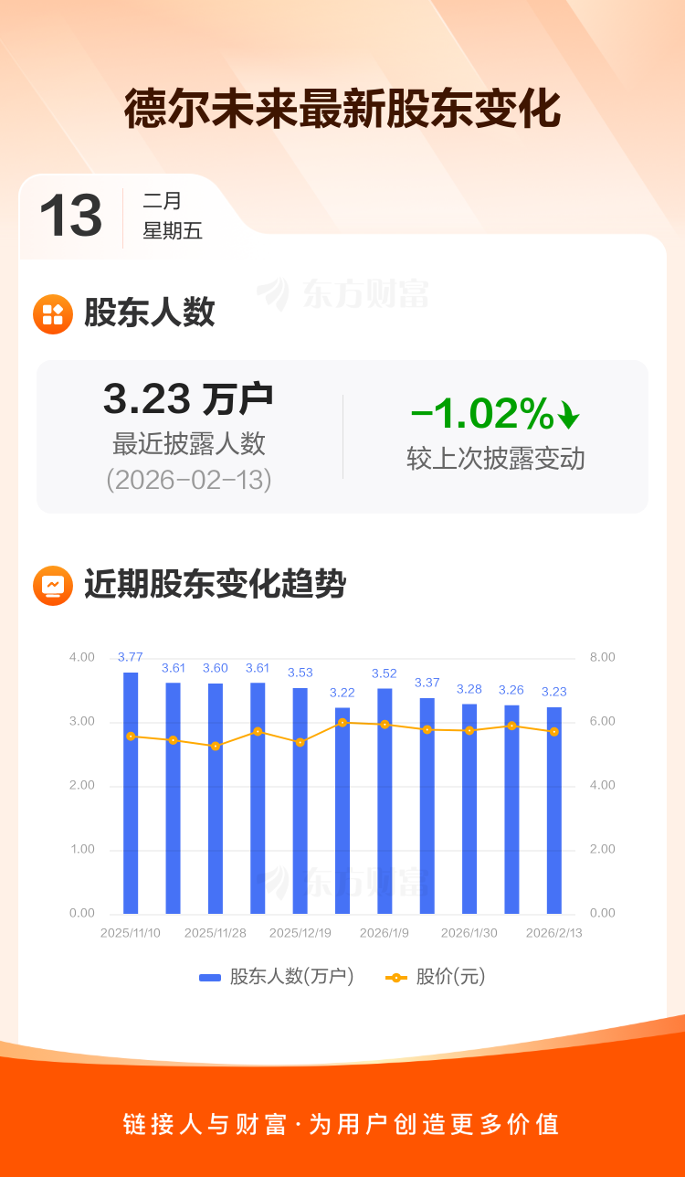 德尔未来:截至2月13日最新股东户数3.23万户,较上期减少1.02%